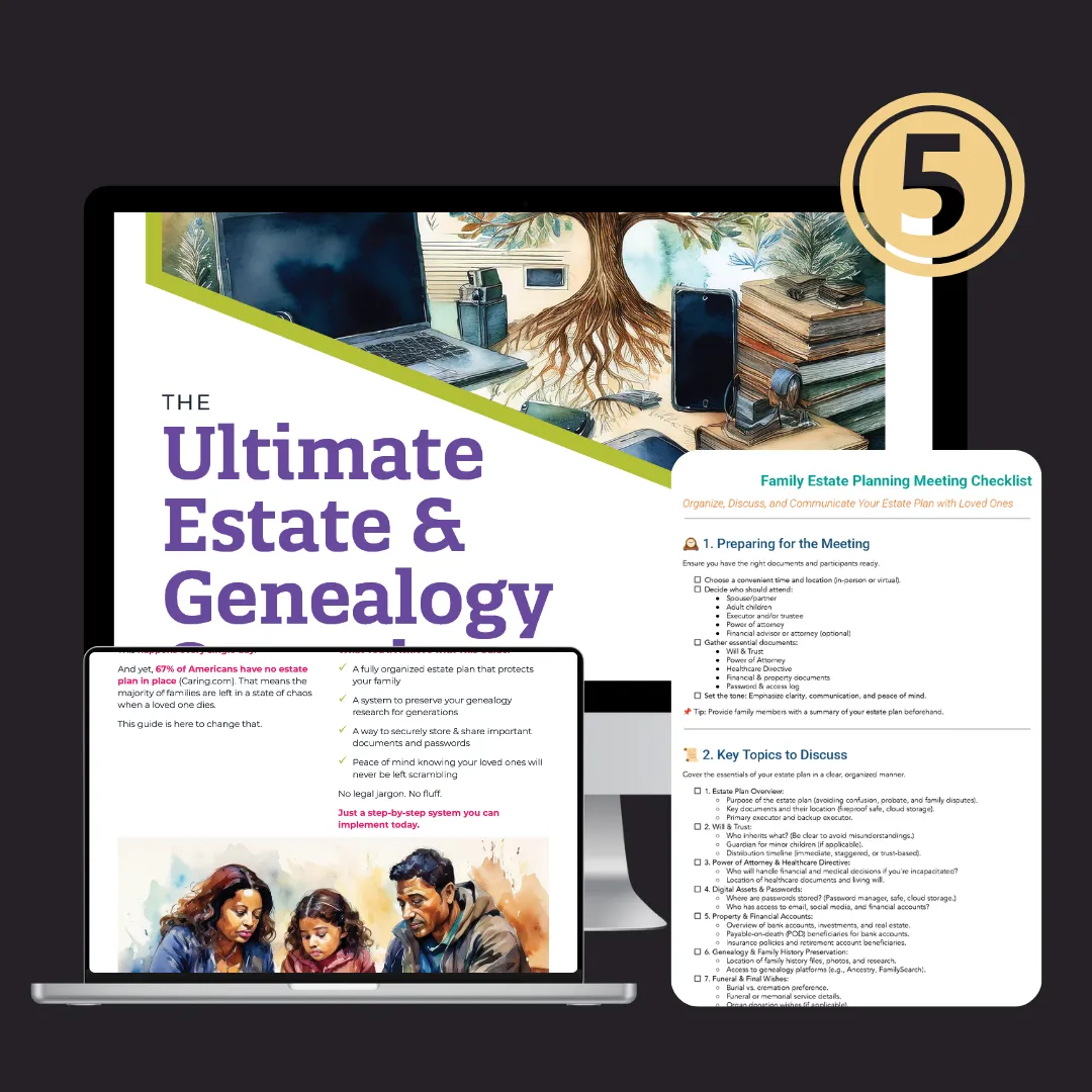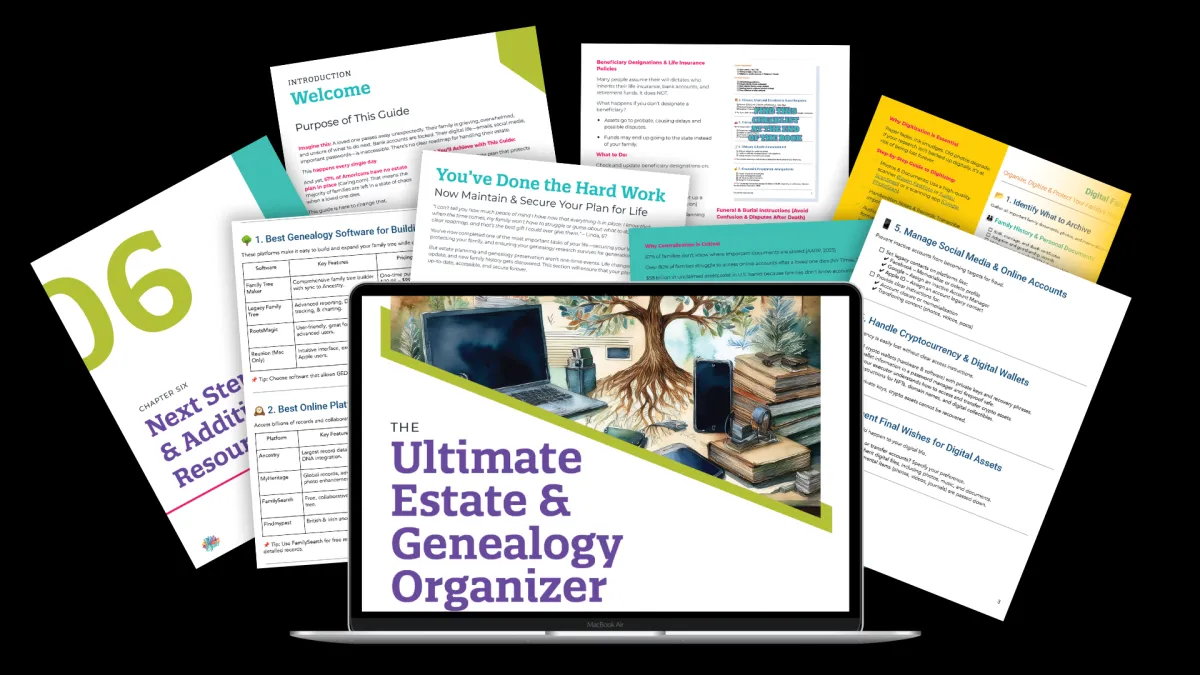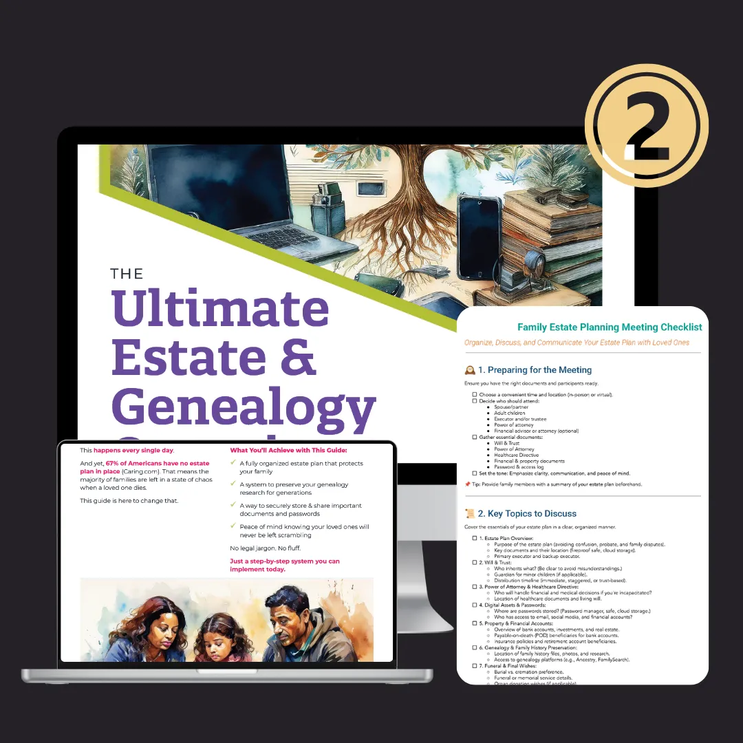 Right after your purchase, you’ll receive instant access to the Ultimate Estate & Genealogy Organizer—your step-by-step guide to protecting your assets, securing your family’s future, and preserving your legacy.